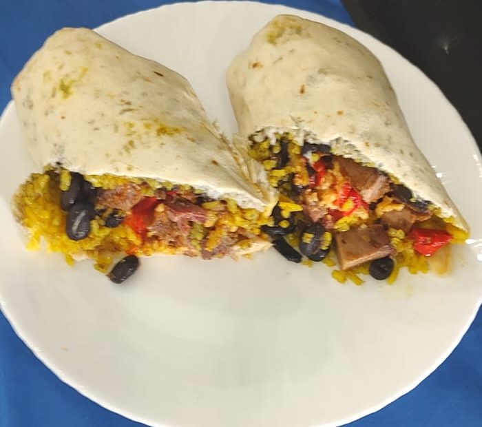 Wrapped in a warm flour tortilla, each burrito is generously filled with tender, smoked beef brisket, savory turmeric rice, black beans, melty cheddar cheese, and topped with our house mole sauce, delivering a delightful kick of spice. Every bite is a symphony of bold, mouthwatering flavors, where the smokiness of the brisket meets the creamy richness of the cheese, all balanced by the zesty heat of the chipotle sauce. Simply heat and enjoy the convenience of a homemade burrito bursting with irresistible Tex-Mex goodness, perfect for any mealtime craving.