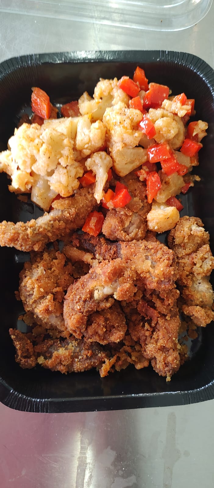 Succulent strips of premium Argentinian sirloin are delicately coated in a keto-friendly batter of almond flour and buttermilk crafted from rich cream and almond milk. Each piece is fried to golden perfection, yielding a crisp exterior that gives way to tender, juicy steak inside. Served alongside roasted cauliflower and sweet red peppers, finished with a generous sprinkle of Parmesan cheese, this dish is a savory, low-carb indulgence that blends rustic comfort with gourmet flair.
