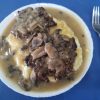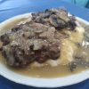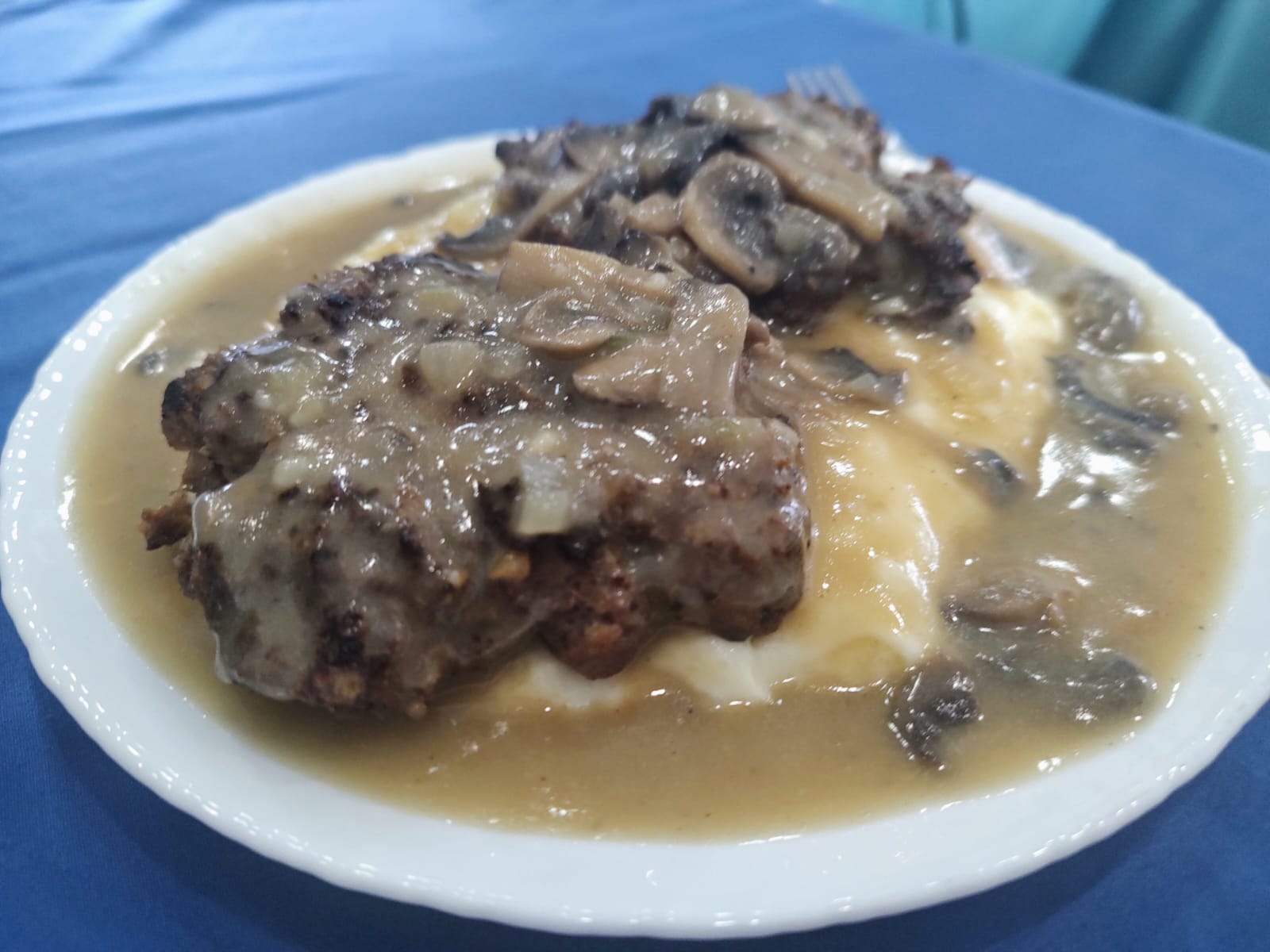 The whole dish is served atop a bed of creamy, buttery mashed potatoes, which perfectly soak up the savory mushroom sauce. Each bite delivers a comforting combination of juicy steak, rich gravy, and fluffy potatoes — a true homestyle classic with layers of bold, satisfying flavor.